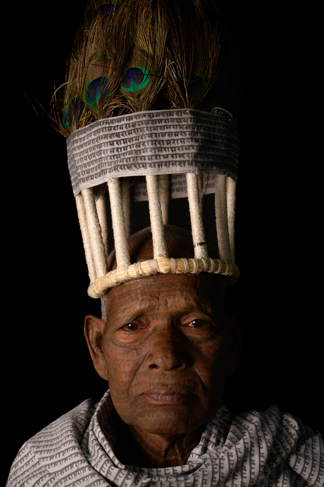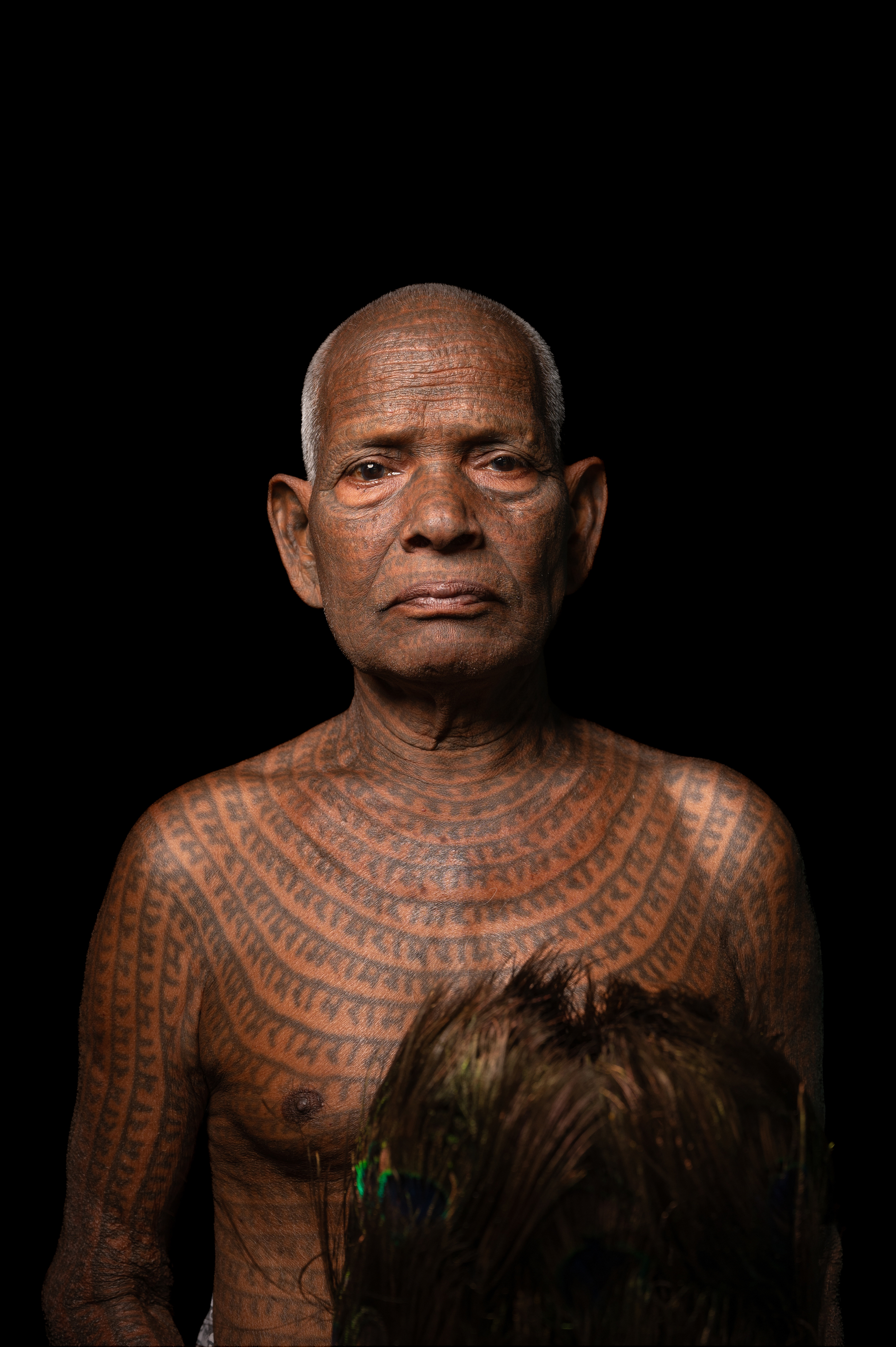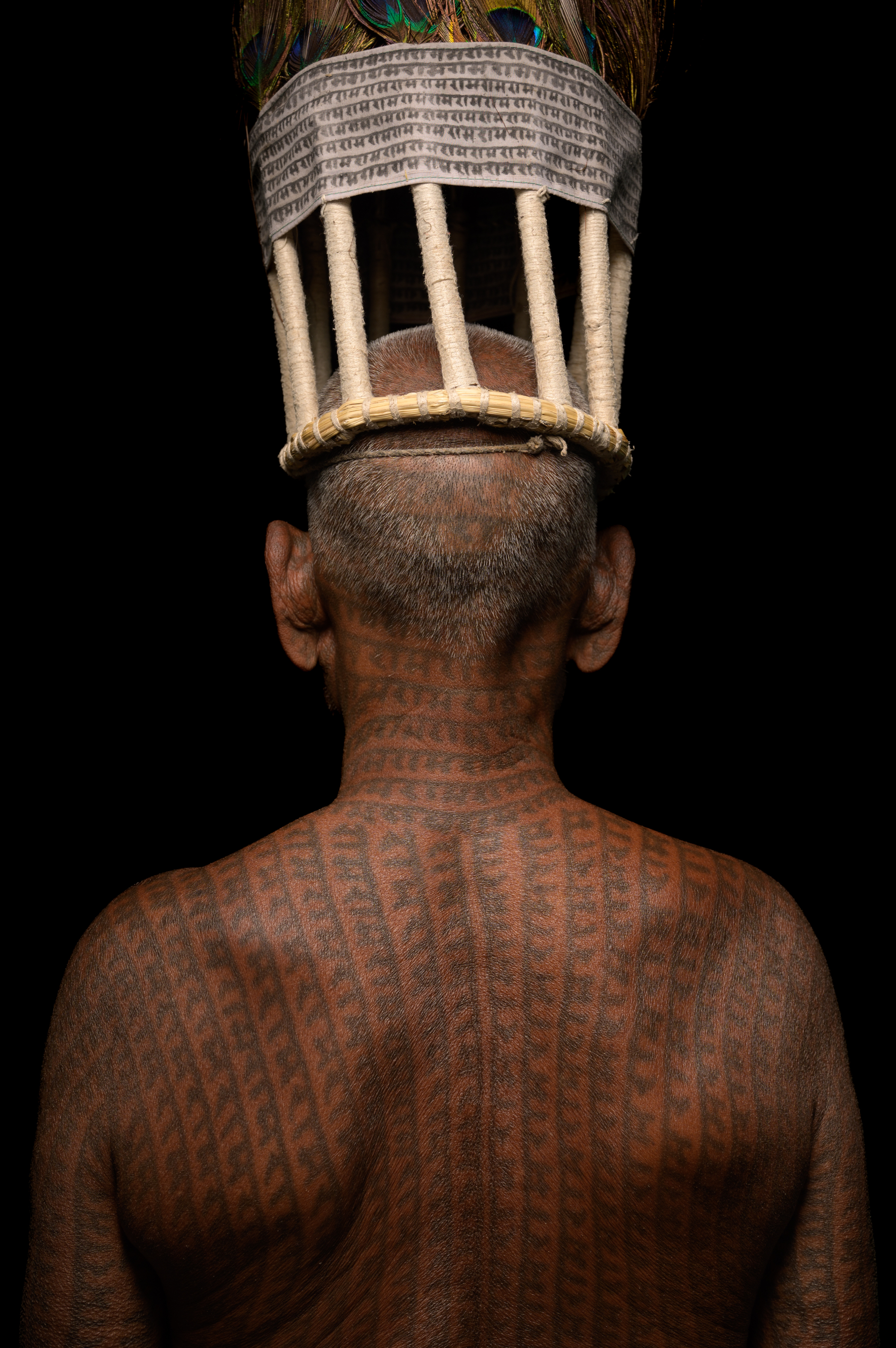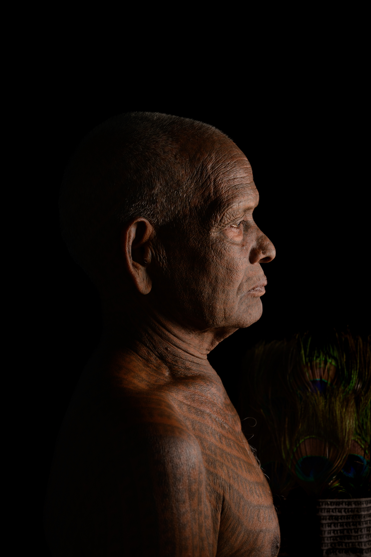 The Ramnami community, once amongst the marginalised in Chhattisgarh, practices the unique tradition of tattooing the name of Lord Ram on their bodies, symbolising both devotion and a protest against social exclusion. The portrait here is of Ram Mehatar, now 83 years old, who started tattooing himself at the age of 14. He belongs to the Naksik section of the community, known for full-body tattoos, and is among the few left who have their entire bodies covered with the name of Ram. His tattoos, made from a mixture of babool tree (Gum Arabica) and castor oil ash, are a testament to his lifelong commitment. This project aims to tell his story of faith, resilience, and identity. If you wish to interact or document the tribe, please reach out to the community here.