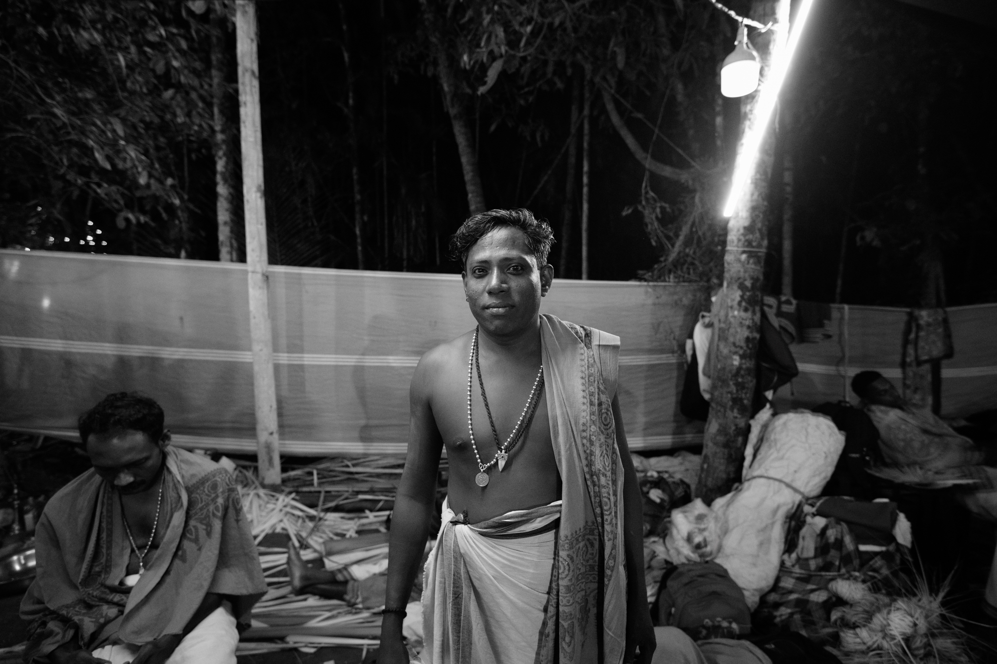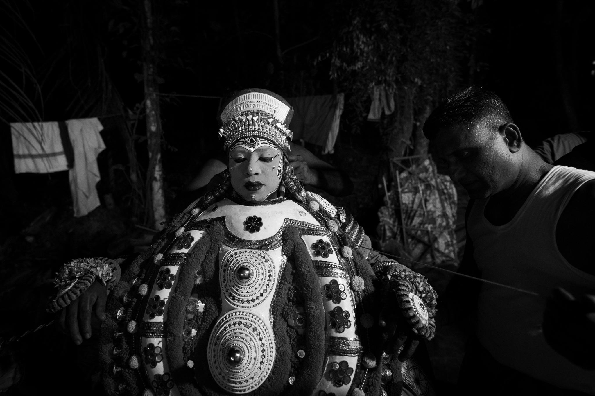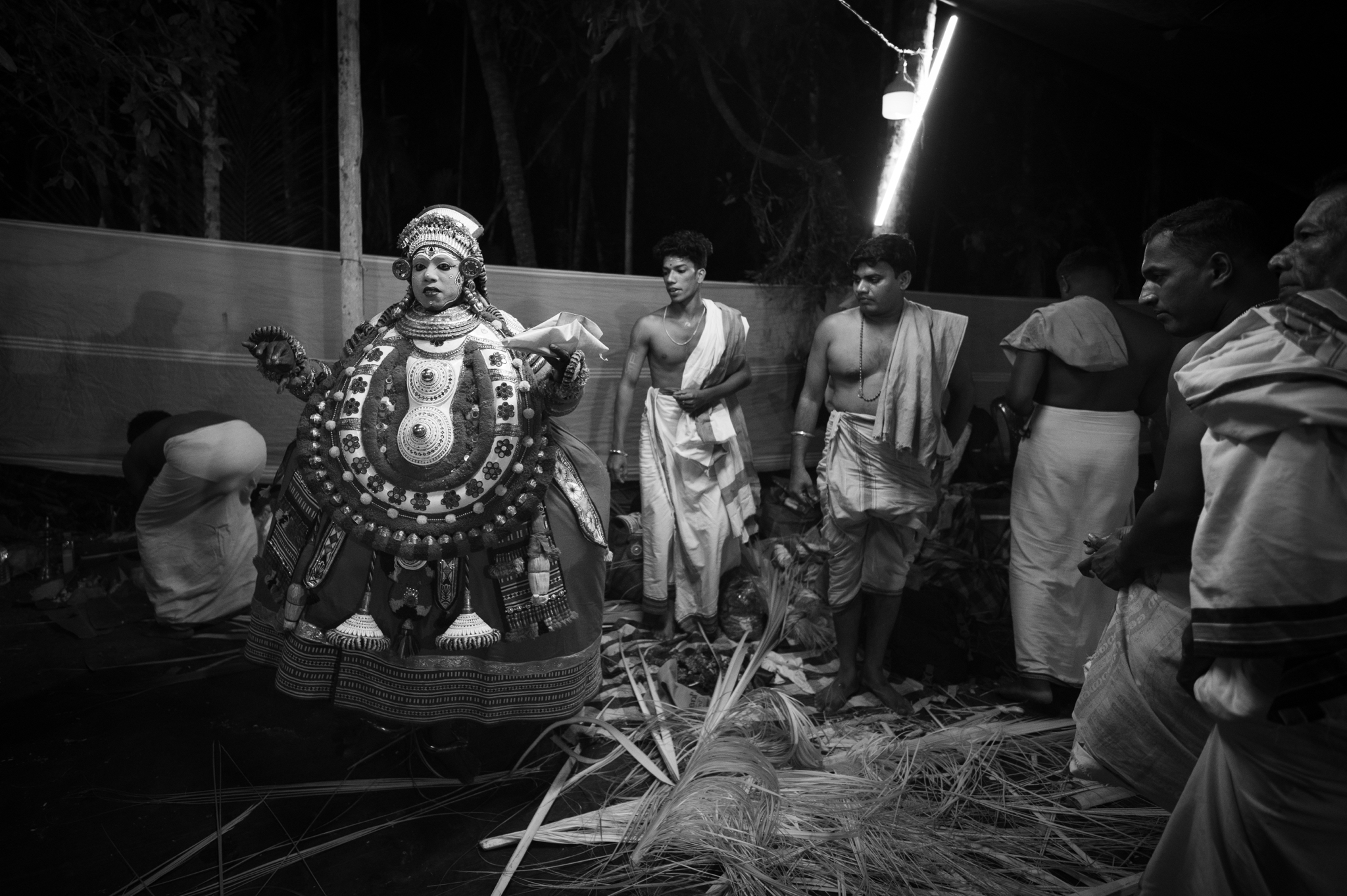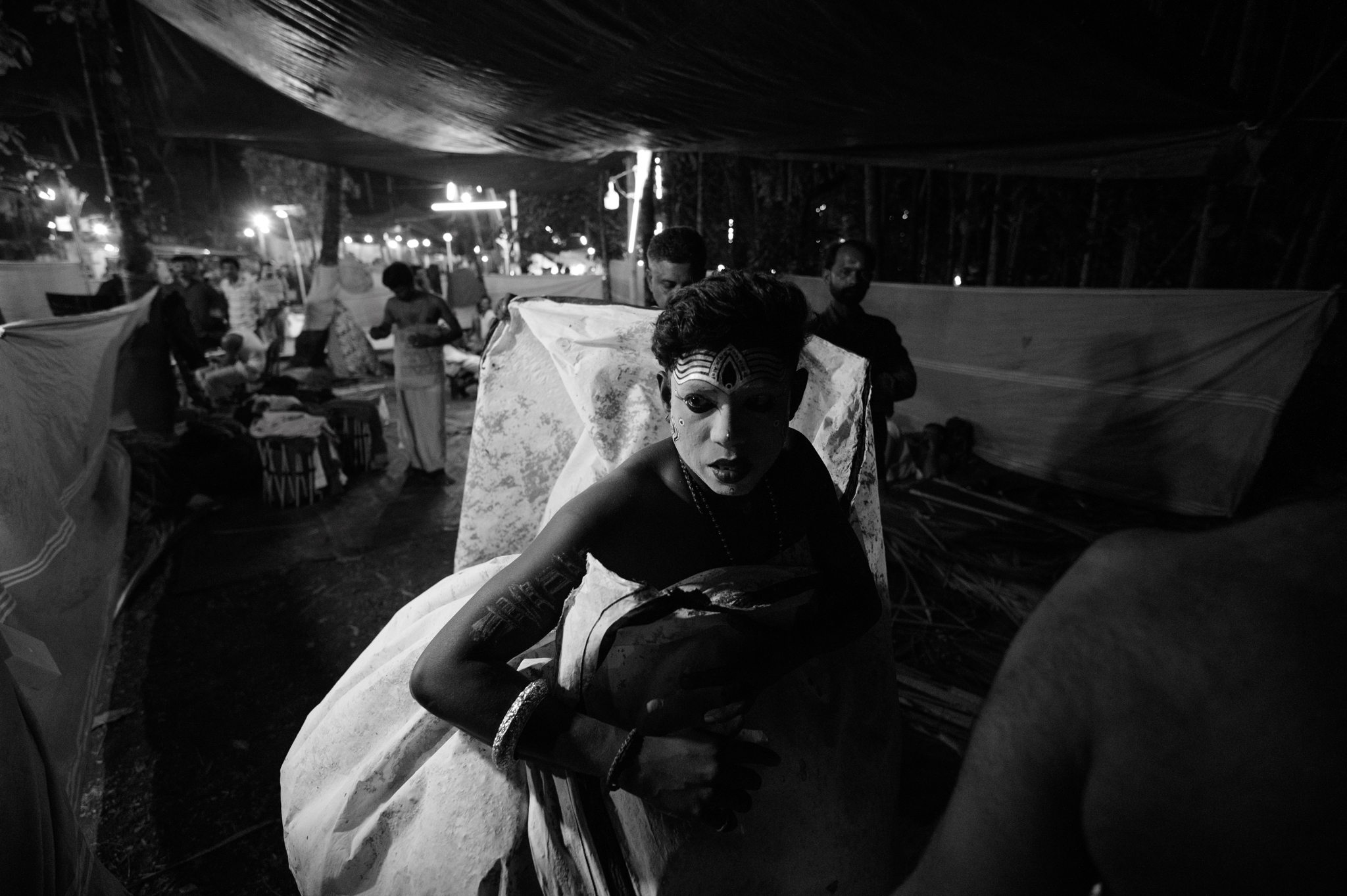 In this gallery, I’ve captured the story of Mukesh Paniker, a Theyyam artist who has been practicing this sacred art since the age of 6. Rather than showcasing the grandeur of the performance itself, I wanted to document the unseen labor and dedication that go into it. Mukesh’s journey is one of devotion and discipline, involving hours of meticulous preparation, from applying layers of traditional makeup to enduring the physical strain of his elaborate costume. Through these images, I’ve focused on the quieter moments of reflection and the artistry that transforms him into a divine figure. This gallery offers a glimpse into the immense hard work that fuels the art of Theyyam, as seen through the eyes of an artist who lives it.