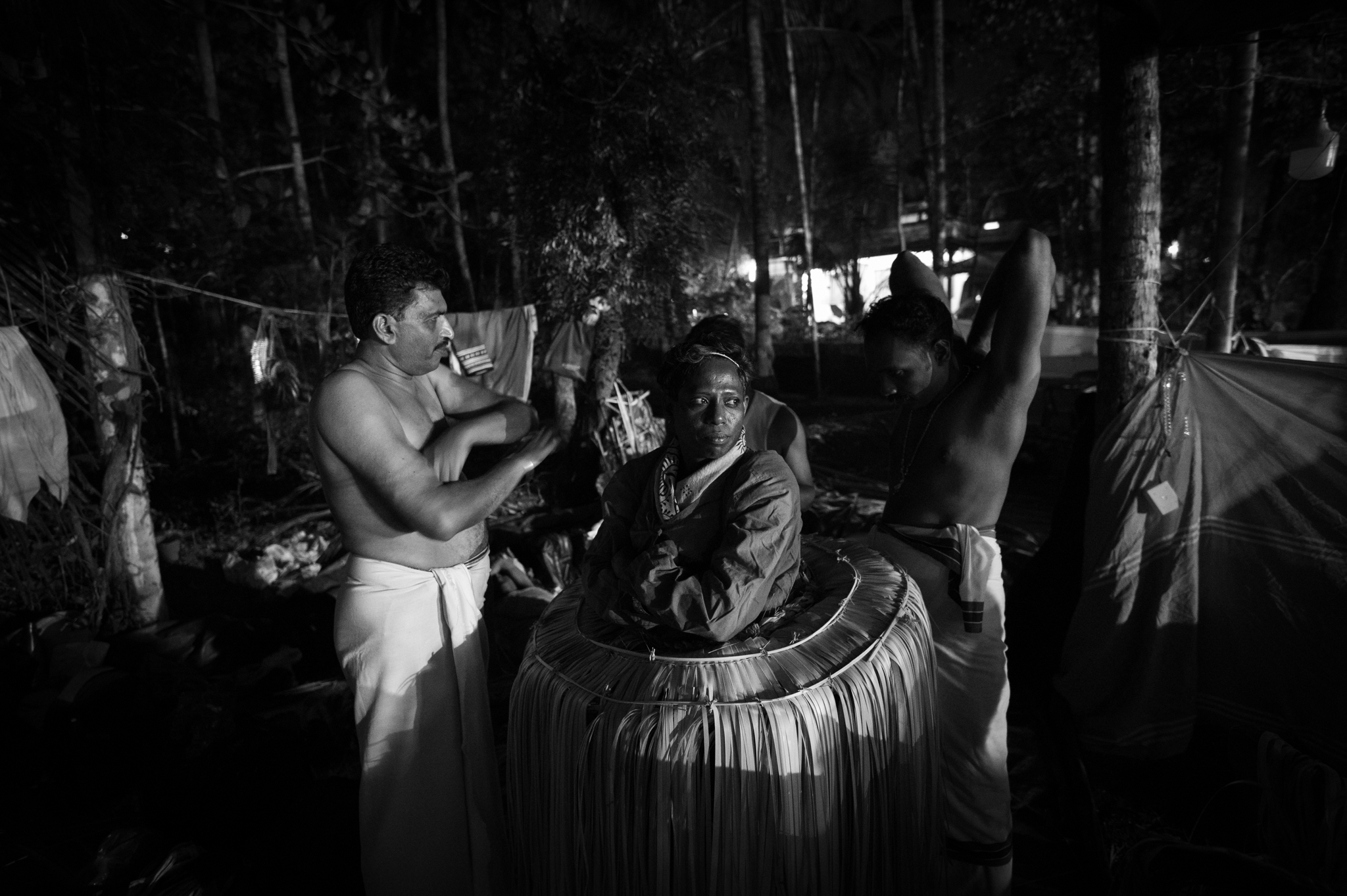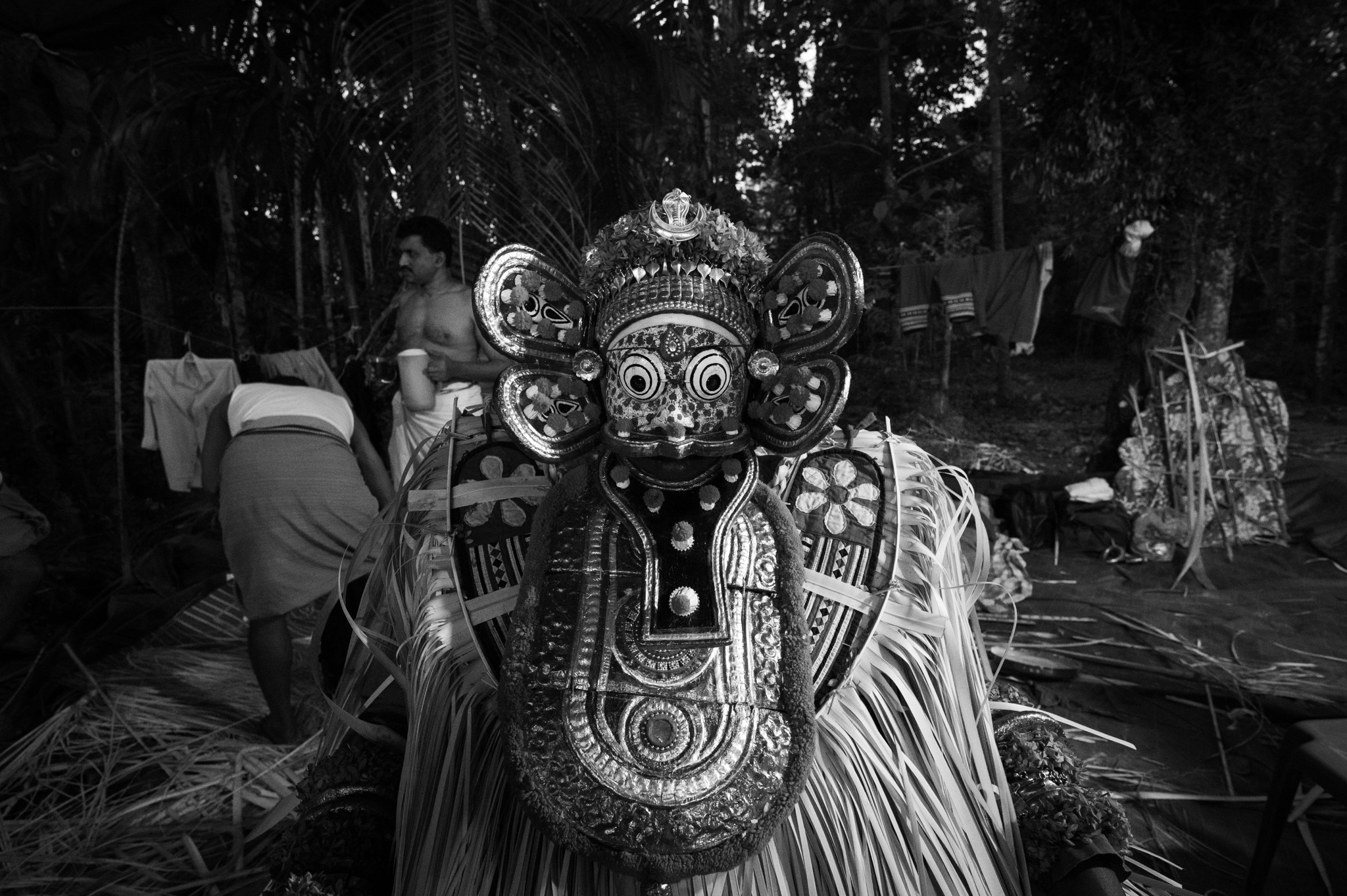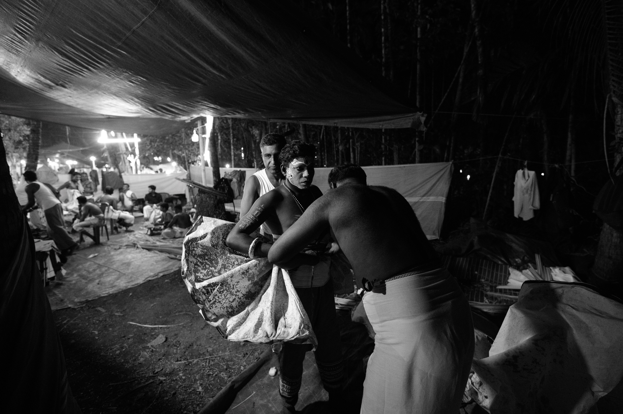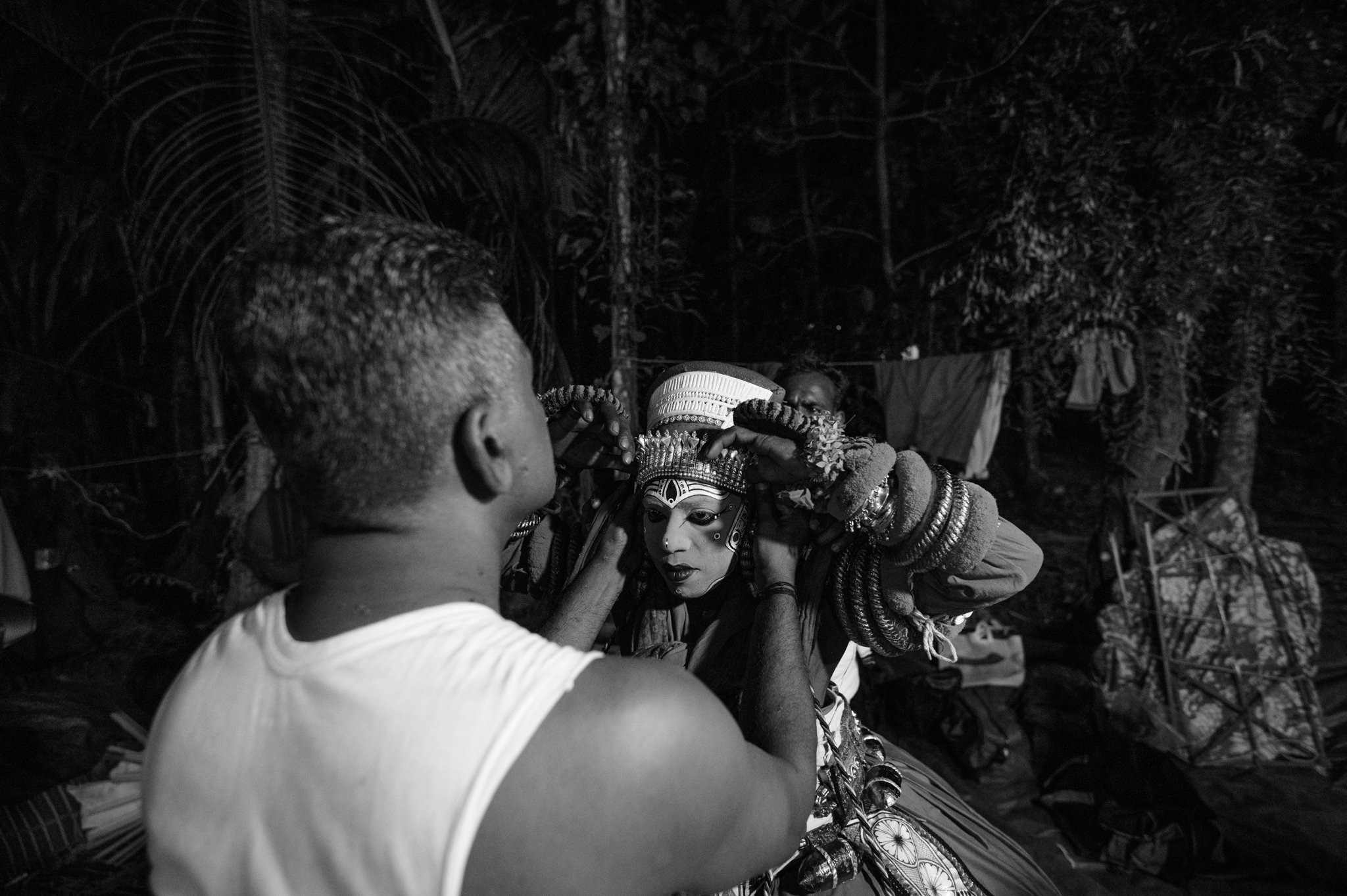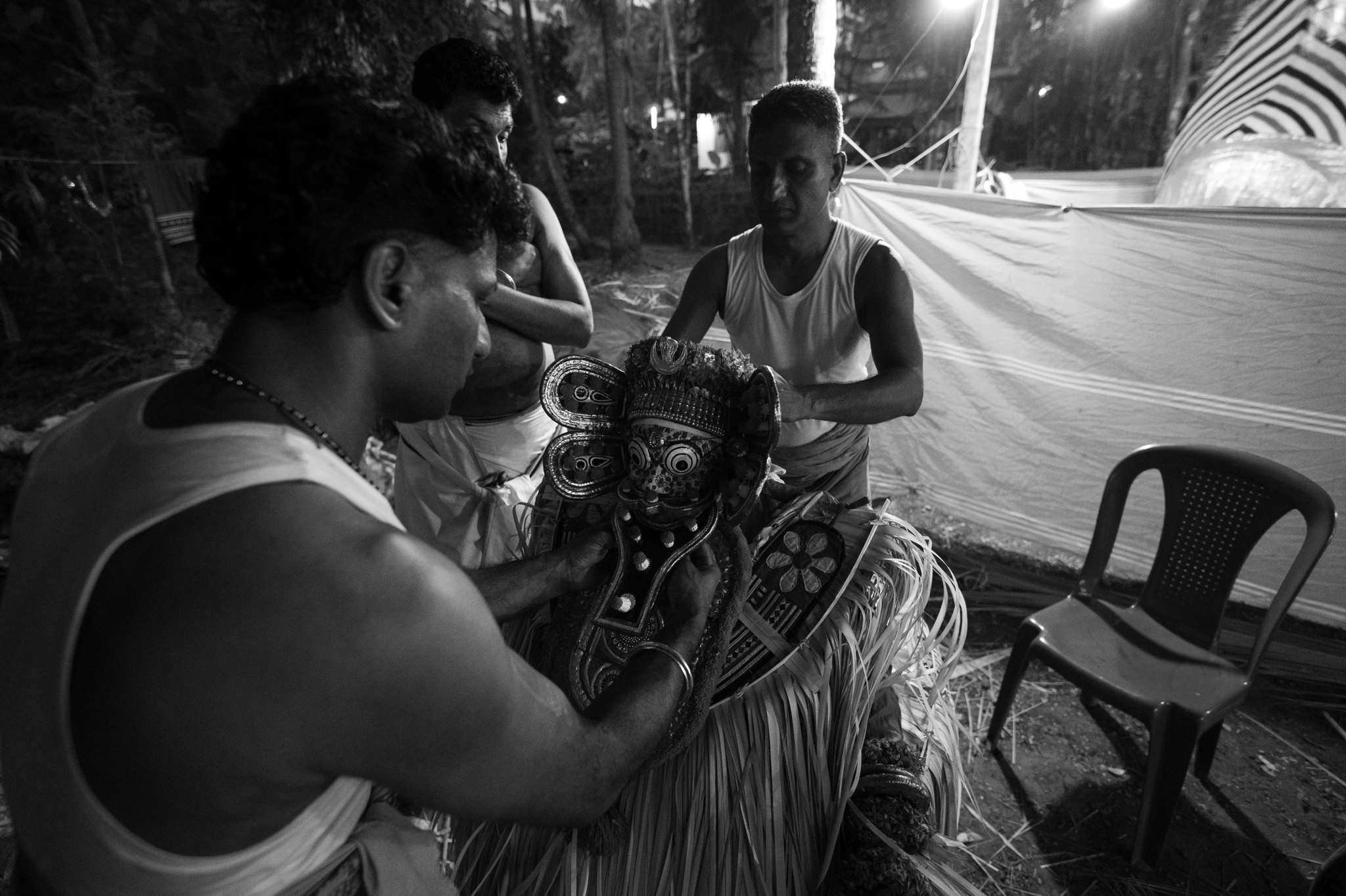 In this gallery, I’ve captured the story of Mukesh Paniker, a Theyyam artist who has been practicing this sacred art since the age of 6. Rather than showcasing the grandeur of the performance itself, I wanted to document the unseen labor and dedication that go into it. Mukesh’s journey is one of devotion and discipline, involving hours of meticulous preparation, from applying layers of traditional makeup to enduring the physical strain of his elaborate costume. Through these images, I’ve focused on the quieter moments of reflection and the artistry that transforms him into a divine figure. This gallery offers a glimpse into the immense hard work that fuels the art of Theyyam, as seen through the eyes of an artist who lives it.